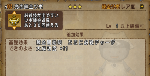 銅のツボ +0 10 13 16 21 鉄のツボ +10 13 16 19 24 銀のツボ +15 16 19 22 27 プラチナのツボ +25 19 22 25 30 超錬金ツボ +35 22 25 28 33 奇跡のツボ +50 24 27 30 35 光のツボ +45 26 29 32 37光の錬金ツボ小の完全情報 ドラクエ10 数値・レシピ・相場など 武 片手剣 両手剣 短剣 ヤリ オノ ツメ ムチ スティック 杖 棍 扇 ハンマー 弓 ブーメラン 鎌 防 アタマ からだ上 からだ下 ウデ 足 盾 アクセサリー 傘 セット装備(セット効果) 道 鍛冶ハンマー 木工刀 さいほう針 錬金ツボ 錬金ランプ フライパン 釣り道具「光の錬金ツボ」の効果で、開幕に必殺チャージがきました 必殺を使用してから「超・結果予知」をする ことで、より狭い範囲にしぼることができます 大成功マスが外に散ってしまったので、「大成功シャッフル」をしましょう